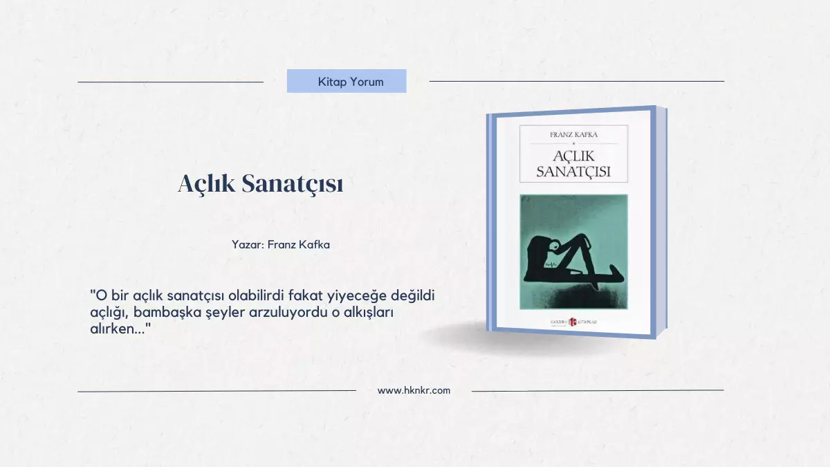 Açlık Sanatçısı adlı cep boy eser, Franz Kafka tarafından kaleme alınan, içerisinde dört (4) adet hikayenin yer aldığı bir öykü/hikaye kitabıdır. Karbon Kitaplar tarafından piyasaya sürülen ve orijinal adı “Ein Hungerkünstler” olan eserin elimde Temmuz 2019 tarihli cep boy ilk basımı yer almaktaydı (Bu arada ilk yayımlanma tarihinin Aralık 2000 olduğunu öğrendim). Almanca aslından eseri çeviren ise Cemre Selvi (kitap kapağında ismine yer verilmemiş). Dünya klasikleri arasında sayılan yaklaşık 56 sayfalık eseri Edebiyat – Öykü türünde nitelendirebiliriz. Eserin başka yayınevleri tarafından yapılan basımları da mevcut (farklı yayınevi farklı çevirmen demek). Kitabın bu cep boy versiyonunu yazıyı yazdığım sıralarda kitap sitelerinde yaklaşık 6 – 7 TL arasında satın alabiliyorduk.
