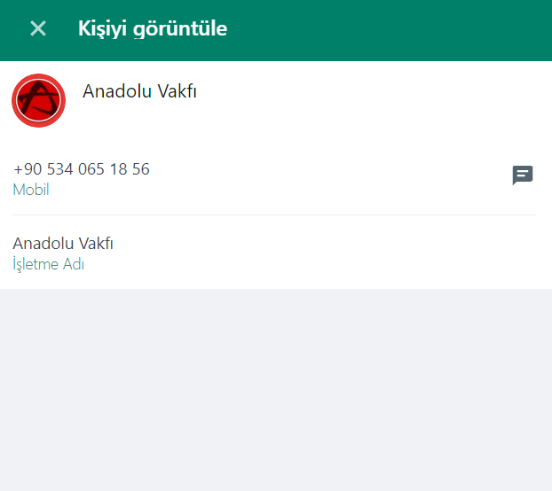 Söz konusu mesajları atan numara Türk bir numara ve İşletme Hesabı olarak WhatsApp üzerinden açılmış. Ayrıca logosunda da vakfın logosu bulunmakta. Tamamen ince düşünülmüş, profesyonel bir dolandırıcılık çalışması izlenimi veriyor zaten. İşte o hesaba ait ekran görüntüsü: