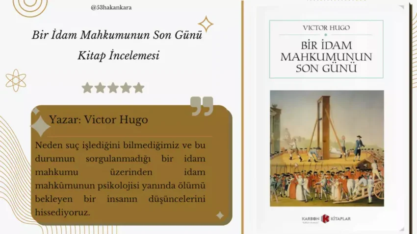 Yaşamın önemini iliklerimize kadar hissettirecek “Bir İdam Mahkumunun Son Günü” adlı eseri bir çırpıda okuyacağınızı ve bakış açınıza katkı sağlayacağını düşünüyorum. Yine de dönemin adeta hukuksuz ve siyasi ortamında alınan kararlar üzerinden derin bir psikolojik ön yargı nedeniyle kaleme alındığını düşündüğüm eserin içeriği sizi 360 derece döndürmesin ancak fikirlerinize katkı sunsun isterim. Eserin beni en çok etkileyen kısmı idam sehpasına giderken izleyen halkın tepkileri ve coşkusu ile bunun betimlendiğini anlar oldu: bir süre sizi derinden etkileyebilecek içeriğe sahip eseri özümseyerek, anlayarak okumanızı tavsiye ediyorum.