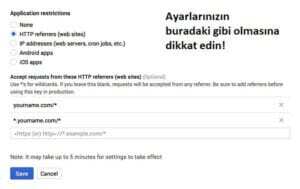 - API Console kısmında anahtarın sadece sizin siteniz tarafından kullanılması seçeneğini işaretlemeyi unutmayın.