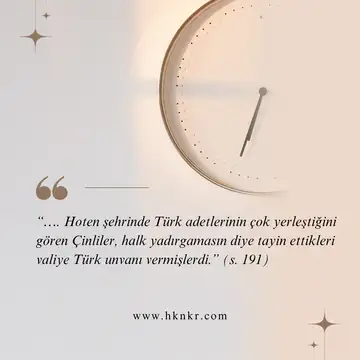 “…. Hoten şehrinde Türk adetlerinin çok yerleştiğini gören Çinliler, halk yadırgamasın diye tayin ettikleri valiye Türk unvanı vermişlerdi.” (s. 191)