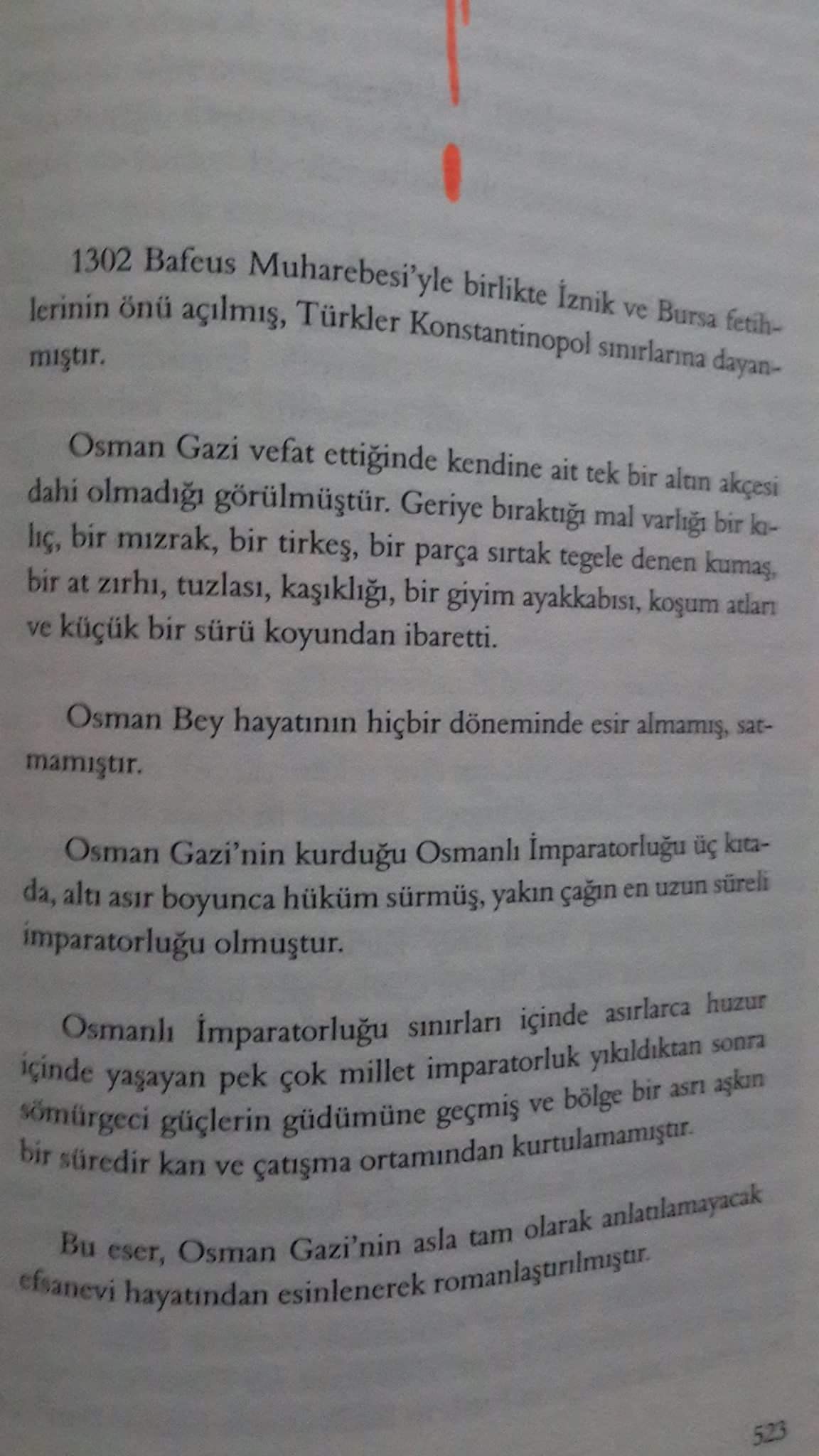 “Bir elinde kılıç, diğerinde kalem olmadan devlet kurulur mu, Osman? … Bir el yıkarken, diğeri yapmayınca denge kurulur mu? Zalimi yerin dibine geçirmedikçe, âlimi yüceltmedikçe medeniyet kurulur mu? Layığını cezalandırmadıkça, liyakati ödüllendirmedikçe adalet olur mu, Osman?” (s. 135)