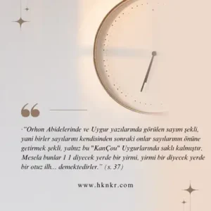 - “Orhon Abidelerinde ve Uygur yazılarında görülen sayım şekli, yani birler sayılarını kendisinden sonraki onlar sayılarının önüne getirmek şekli, yalnız bu “KanÇou” Uygurlarında saklı kalmıştır. Mesela bunlar 1 1 diyecek yerde bir yirmi, yirmi bir diyecek yerde bir otuz ilh… demektedirler.” (s. 37)