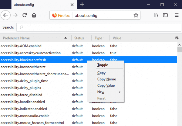 Bir de Mozilla Firefox üzerinde ufak ayarlamalar yaparak otomatik yenilemeyi kapatabilirsiniz. Bunun için URL kısmına about: config yazın ve enter tuşuna basın. Açılan kısımda arama çubuğuna accessibility.blockautorefresh yazın ve accessibility.blockautorefresh seçeneğine sağ tıklayıp “Toggle” seçeneğini seçin ve web sayfası otomatik yenilemeyi devre dışı bırakmak için “false” olan değeri “true” olarak değiştirin.
