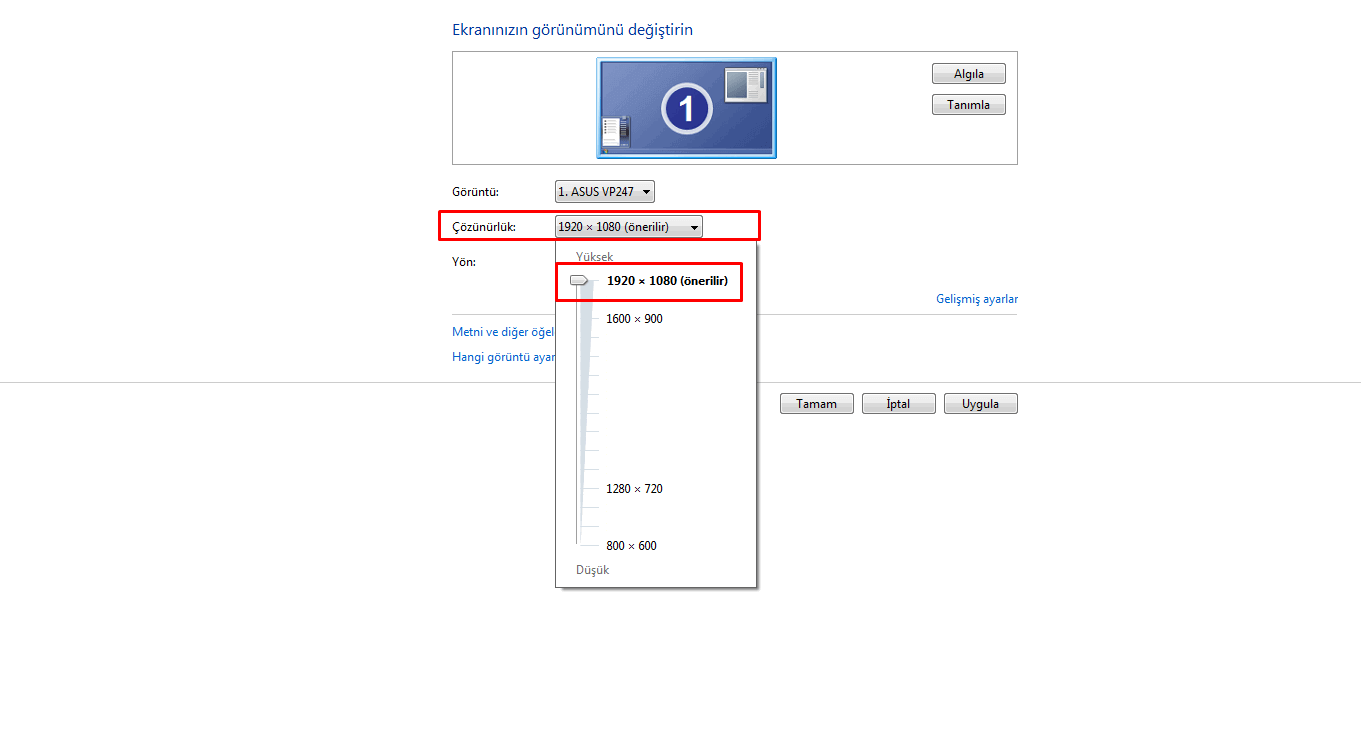 5. Ardından çözünürlüğün yanındaki butona tıklayarak önerilen çözünürlüğe getirin. Yani en yüksek olana getirin mesela…