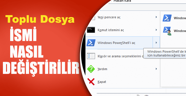 - Öncelikle dosya isimlerini değiştirmek istediğimiz dosyaları, bir klasörün içerisine topluyoruz. – yukarıda olduğu gibi – daha sonrasında klasör içerisindeyken sağ üst tarafta bulunan dosyaya tıklayıp ” Windows Powershell’i aç ” seçeneğine tıklıyoruz, mavi bir ekran karşımıza gelecek. Powershell, isimlerini değiştirmek istediğimiz dosyaların bulunduğu klasöre özel açılacak; yani yapacağımız işlemler otomatik olarak dosyaların bulunduğu klasör üzerine olacak.
