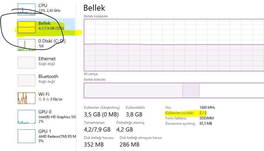 - Bu ekranda sarı ile boyadığım yer, sizin bilgisayarınızda bulunan slot/yuva sayısını göstermektedir. Benim kullandığım bilgisayarda 2 yuva var ve 2 ram var demek oluyor bu sonuç. Yani boş ram slotu bulunmuyor. :) Fakat kullanılan bilgisayara göre bu sayı değişebilir; örneğin sarı ile boyanan yerde rakam olarak 1/4 yazabilirdi, bu da şu anlama gelirdi: 4 slot var ama 1 tanesinde ram takılı durumda... 2/5 yazsaydı; 5 ram slot yeri var ve 2 ram takılı demek olacaktı. Buna göre değerlendirebilirsiniz ve boş ram slotu olup olmadığını görebilirsiniz.