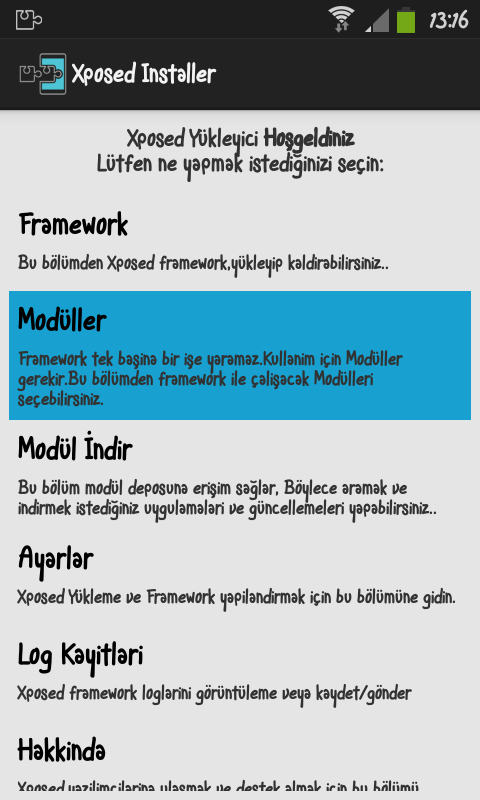 - Şimdi geldik indirdiğimiz dosyanın içerisinden çıkan 2. dosyayı kurmaya… GravityBox’u yüklüyoruz. Yükleme işlemi bittikten sonra Xposed İnstaller uygulamasını tekrar açıyoruz ve modüllere tıklıyoruz. Açılan kısımda GravityBox uygulamasını işaretliyoruz. Telefonu açma kapama tuşuna basılı tutarak yeniden başlatıyoruz.