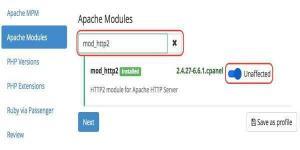WHM’de oturum açın ve Ana Sayfa >> Yazılım >> EasyApache 4 >> Özelleştir >> Apache modüllerine gidin, eğer mod_mpm_prefork etkin ise bunu devre dışı bırakın, değişiklikleri incelemek için ‘incele‘ düğmesine tıklayın ve ‘Provizyon‘ düğmesine tıklayın. Ardından, Ana Sayfa >> Yazılım >> EasyApache 4 >> Özelleştir >> Apache modüllerine gidin, ‘mod_http2‘ modülünü arayın ve etkinleştirin: