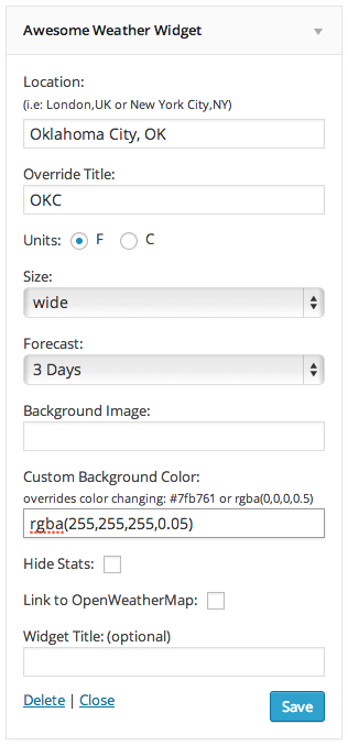 [awesome-weather location="Istanbul" units="F" size="tall" override_title="MTL" forecast_days="2" hide_stats=1 background="http://siteadi.com/foto.jpg" custom_bg_color="#cccccc" inline_style="width: 200px; margin: 20px; float: left;"]
