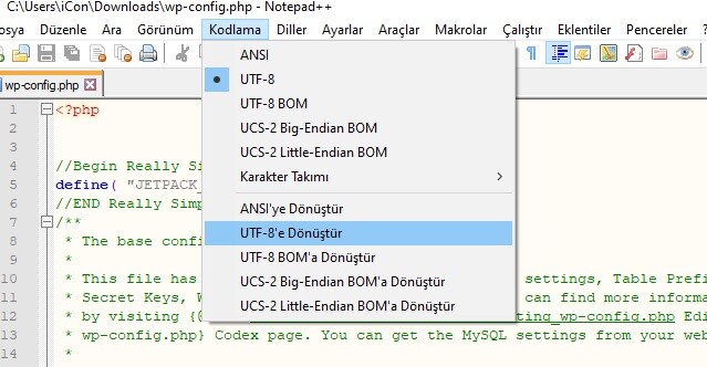 Öncelikle Cpanelinizin üzerinden (veya Plesk panel, fark etmez.) siteniz ana dizininde yer alan wp-config.php dosyanızı bilgisayarınıza indirin. Bu indirdiğiniz php dosyasını Notepad++ yardımıyla açın. (yani dosyaya sağ tıklayıp, Notepad++ ile aç deyin, zaten direkt düzenleme ekranı açılacak)