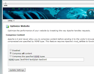 - Cpanelinize giriş yapınız ve programlar/servisler kısmında yer alan ” optimize website ” ye tıklayın. Açılan kısımda compress all seçeneğini işaretleyip update settings deyip kaydedin. Böylelikle sitenizde gzip aktifleşmiş olacak.